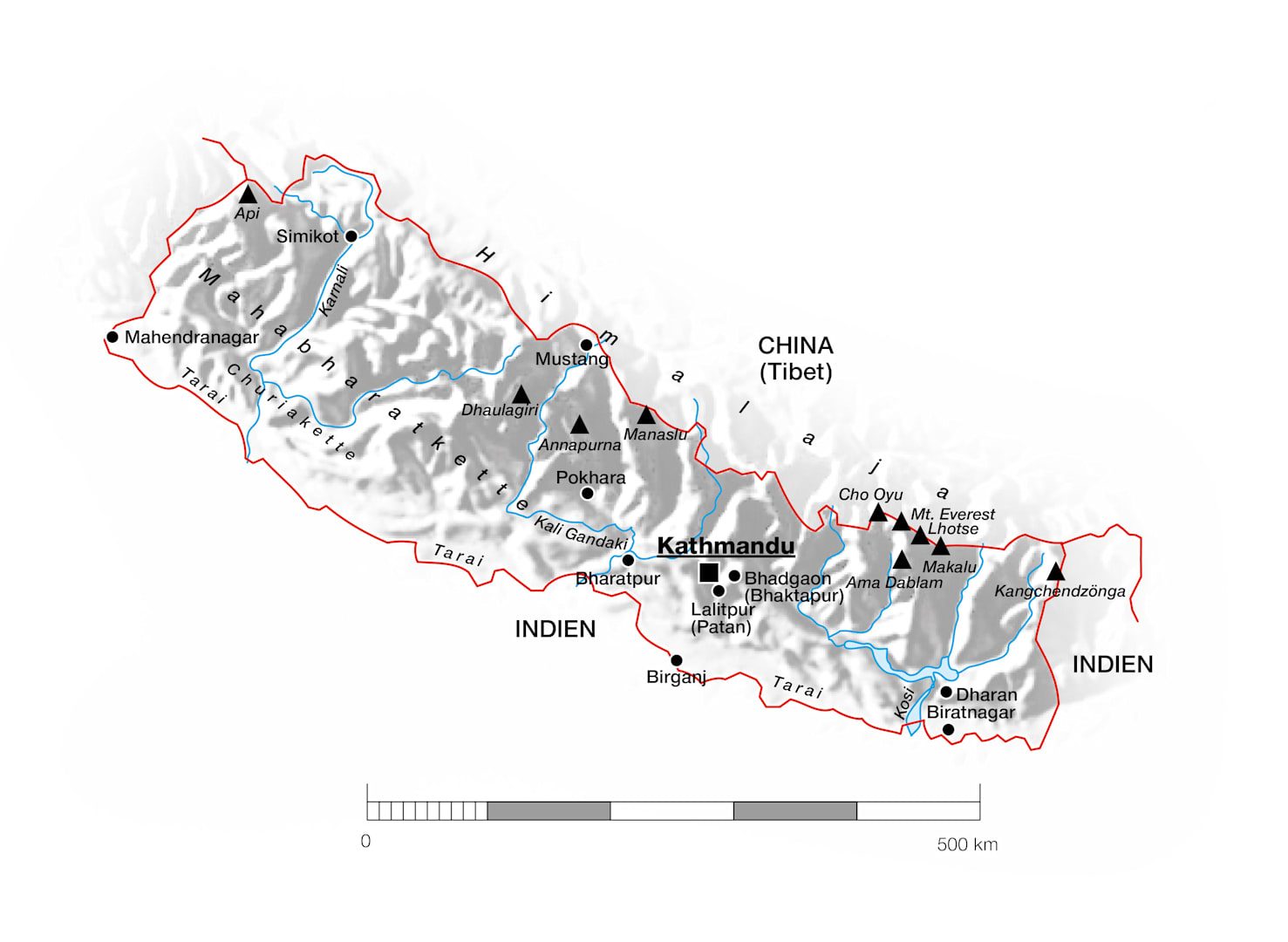 Nepal, amtlich (seit 28.5.2008) nepalesisch Samghiya Loktantrik Ganatantratmak Nepal, deutsch Demokratische Bundesrepublik Nepal, vorher Nepal Adhirajya, deutsch Königreich Nepal, Binnenstaat im Himalaja; Hauptstadt ist Kathmandu.
