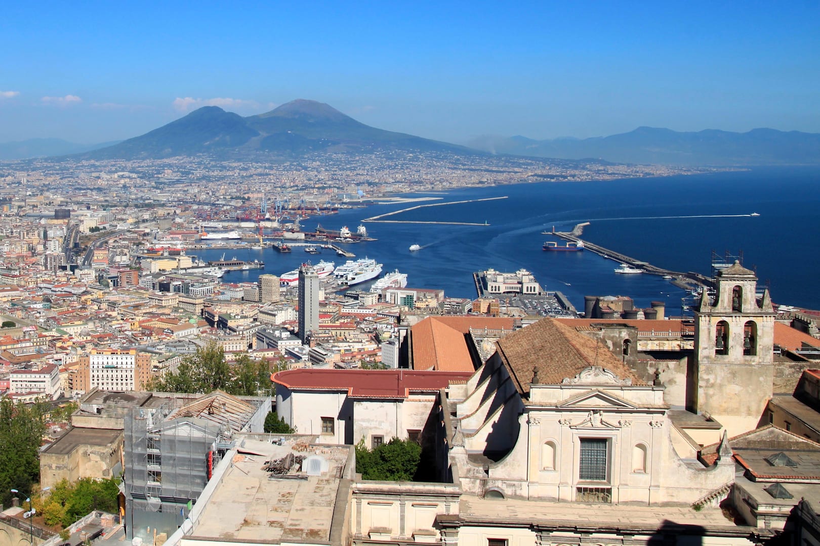 Neapel, italienisch Napoli, größte Stadt Süditaliens, am Golf von Neapel, bis an den Nord- und Westfuß des Vesuvs reichend, umgeben von den Phlegräischen Feldern, 15 m über dem Meeresspiegel, (2019) 959 200 Einwohner.